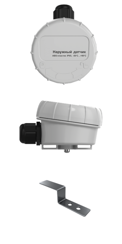 Датчик температуры наружного воздуха в корпусе из ABS-пластика. Измерительный элемент расположен внутри корпуса, подключение осуществляется с помощью встроенных клемм 1,5-2,5 мм2. Для крепления на стену используется Z-образная скоба.